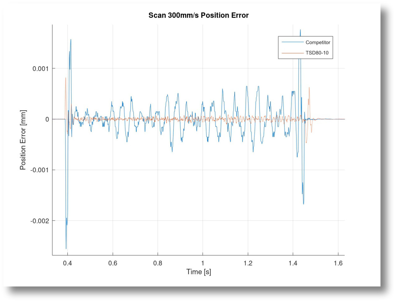 In December 2020, a customer compared the previously used ultra-precision drive of a leading competitor with the TSD80. With both systems, standstill noise below 100nm 1σ was possible. For currents up to 5A, the Triamec Drive had the lowest noise; at 15A, the competitor may have been better. The smaller measurement bandwidth of the competitor has an important impact on the measurements, as can be seen in the red (1kHz measurement bandwidth) and blue (20kHz measurement bandwidth) graphs. This makes a direct comparison difficult. Trying to do one with an encoder splitter has not been successful yet (EDIT 2023-07-26: further testing with 3rd party measurement tools showed 37% lower standstill noise for TSD80-10 compared to the competitor). The Triamec Drive was superior in dynamic motion, with faster move-and-settle and better path fidelity. At 300mm/s traverse speed, the competitor's position error was 1.36μm peak-to-peak. The TSD80-10's position error was an order of magnitude smaller at 0.17μm peak-to-peak. In terms of price, the two solutions are comparable. The commissioning and optimization of the axis and the measurements took 3 days. The better control is also perceived by customers intuitively: With 100kHz Triamec Drives, the machine moves significantly quieter than with drives with lower control frequencies.