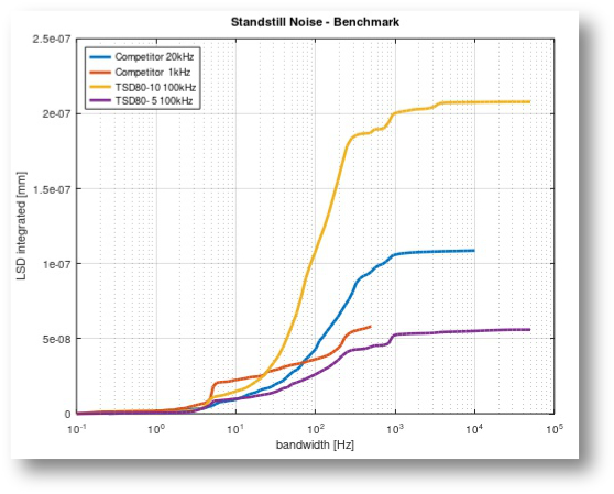 For comparison, 140pm is the diameter of an aluminum atom. To confirm the IPT results, Triamec compared the TS151 and the TSD80-10 in its own lab in December 2020 on a 2μm scale cross-roller bearing machine tool axis with a linear motor. The TS151 achieved a 1σ standstill noise of 445pm. The new generation TSD80-10 achieved 182pm, more than twice as good.
