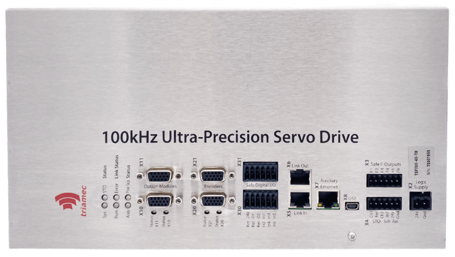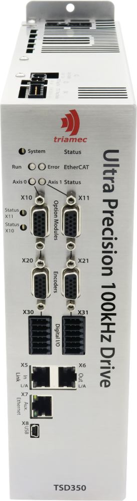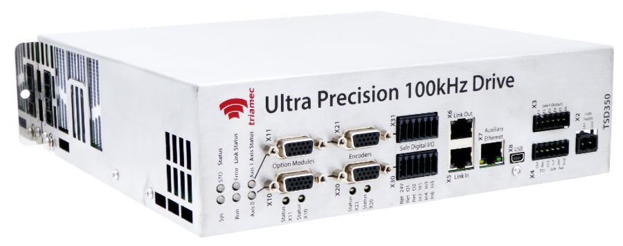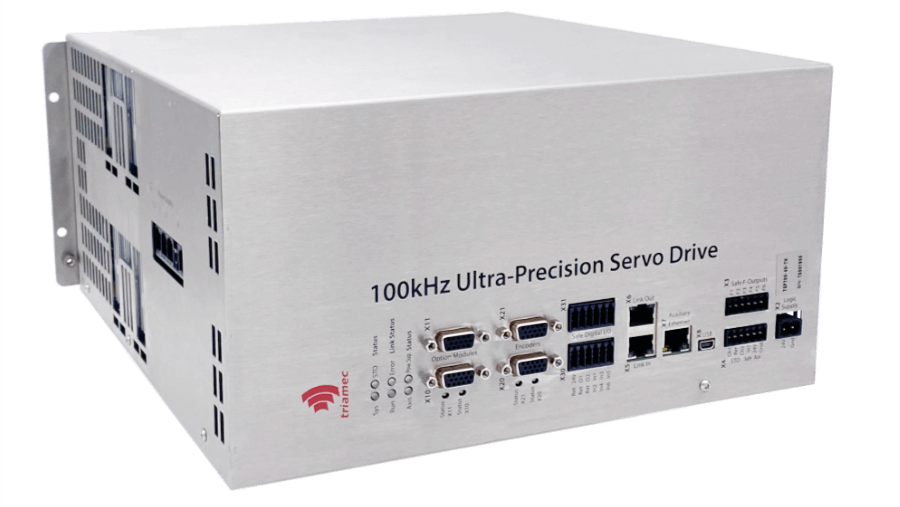 Triamec servo drives have the superior control characteristics required for direct-driven axes in applications such as parallel kinematics systems, ultra-precision machining, positioning spindles, and positioning tables (<0.1nm standstill jitter). The TSD series combines two complete servo drives in one housing, with current and position controllers working in-sync at 100kHz. The TSP series has an integrated AC power supply and achieves a significant reduction of power dissipation with the 3-level 100kHz PWM technology, reducing thermal loads from the spindle motor and increasing overall precision.