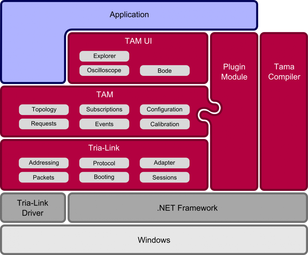 The Microsoft .NET Framework-based TAM API (red) provides the protocol layer of the Tria-Link and above it the TAM system layer. A typical application (blue) is based on the TAM layer interface and also uses plug-in modules and graphic components for the user interface (TAM UI). The Tama compiler is used to compile real-time programs that are executed on the devices.