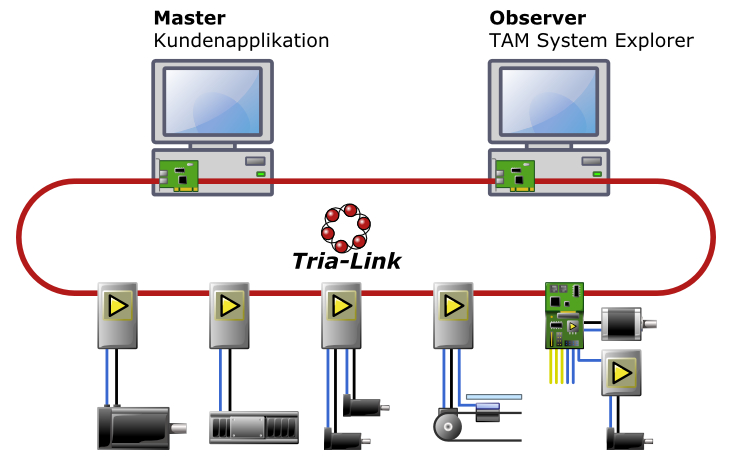Alternatively to using a TL PCIe adapter a servo drive in Tria-Link Master Mode can be used to connect multiple drives to each other and to upper level control. The master servo drive then connects via Ethernet to an industrial PC.